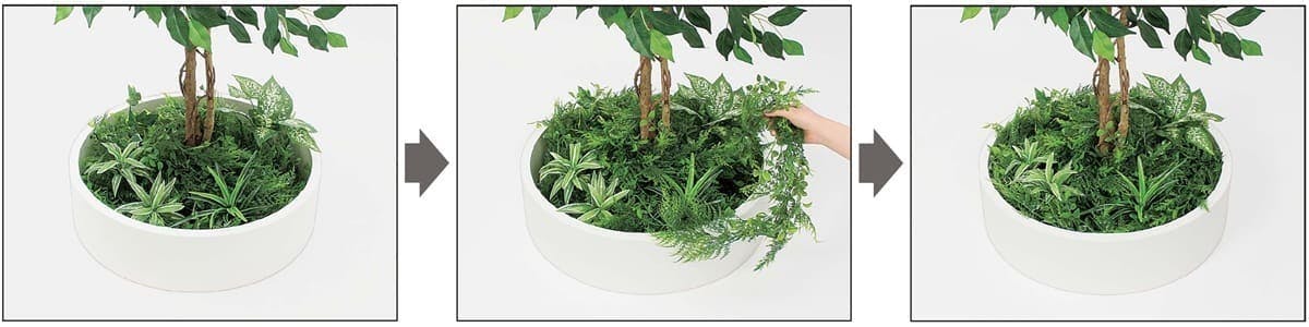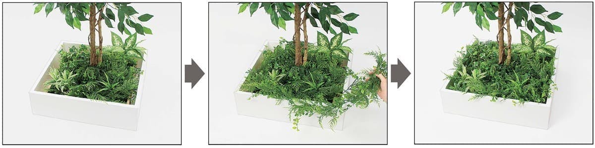 テーブル樹木は、お手持ちのプラントボックスに入れて使える商品です。規格品本体をプラントボックスに置いた後に、付属の下草ピース(ガーランド)で内部にできた隙間を埋めて仕上げます。隙間が均一に埋まるようにセットしてください。