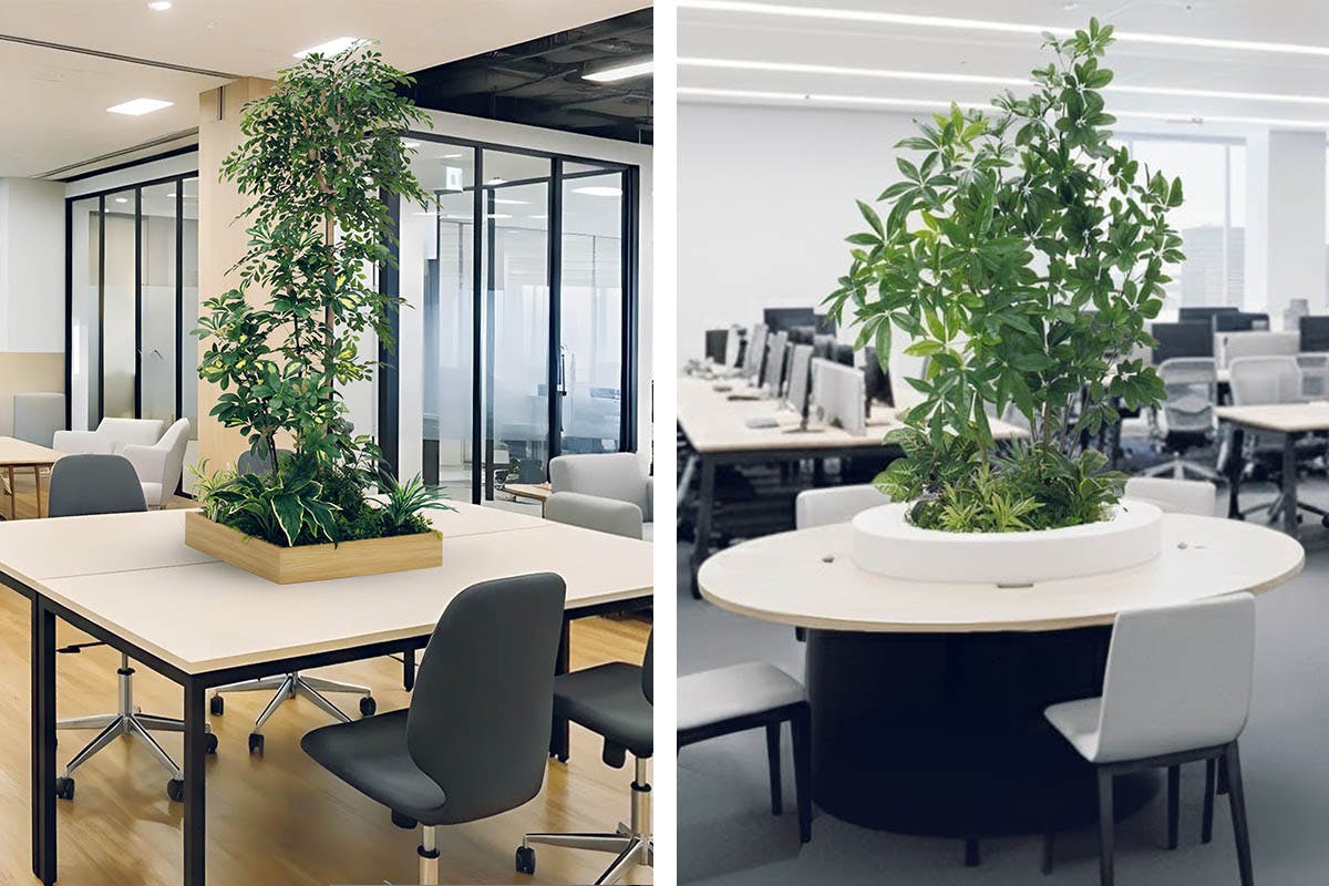テーブル樹木は「角タイプ」と「円タイプ」を用意しているため、テーブル形状やプラントボックスに合わせた設置が可能です。