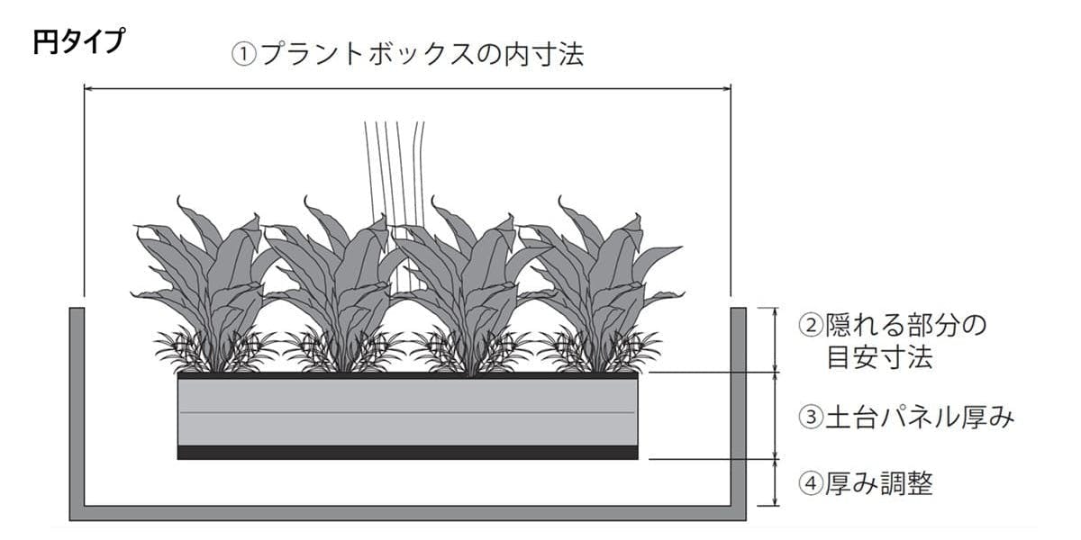 ※45φの規格品(土台パネル外寸法w440×d440×h78mm)をプラントボックス(内寸法φ520mm、深さ150mm)にセットしたイメージ