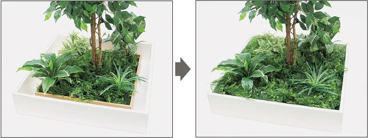 テーブル樹木は、お手持ちのプラントボックスに入れて使える商品です。規格品本体をプラントボックスに置いた後に、付属の下草ピース(ガーランド)で内部にできた隙間を埋めて仕上げます。隙間が均一に埋まるようにセットしてください。